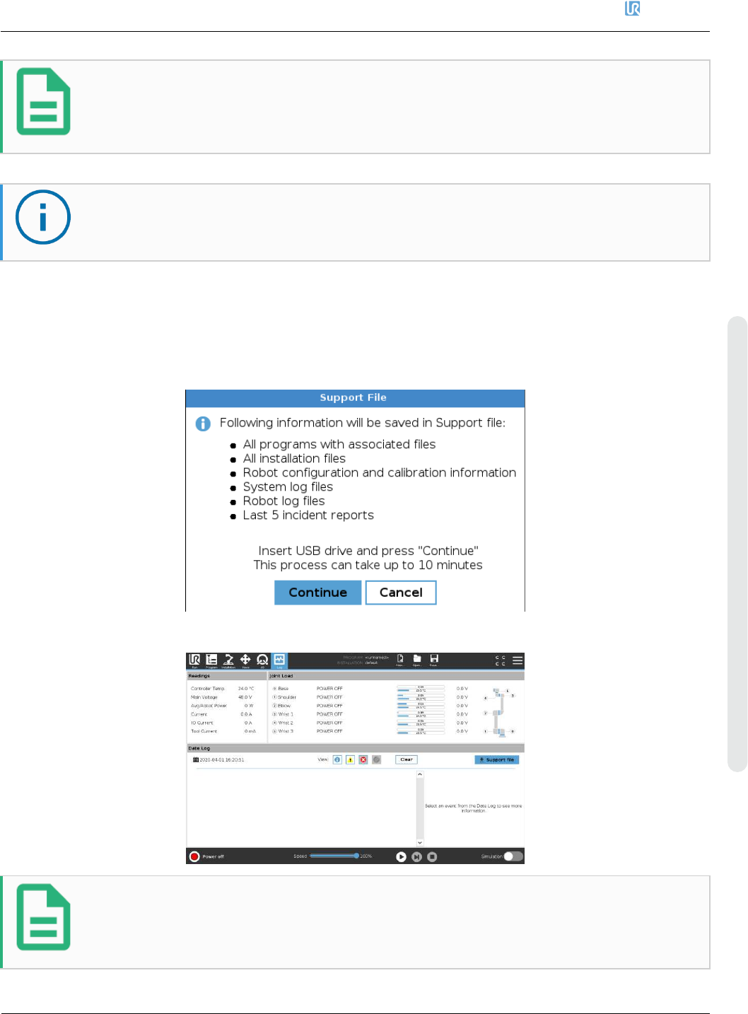 5. 软件 优傲 机器人 维修手册 63 维修手册 版权 © 2009 – 2020 优傲机器人公 司版权所有。保留所有权利。 注 系统备份需要约 4Gb 的 内存,请使用容量在 4Gb 以 上的 U 盘。 注意 请务必在更新软件之前 备份程序和安装文件。 5.2. 使用 Support File 为方便备份,优傲机器 人提供一个 5.8 或以上版本的软件可 以使用的功能,即 Support File ,通 过此功 能可自动将机器人数据…