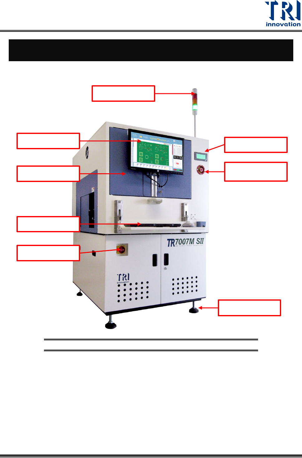 Test Research, Inc. T R7007M SII User Guide – Hardware 1 1 機器簡介 TR 70 07 M SII 外觀及重 要零組件 圖 1 : TR 7007 M SII 前視圖 三色燈 螢幕 鍵盤與滑鼠 主電源開關 緊急停止按紐 人機介面 地坪螺絲 前蓋