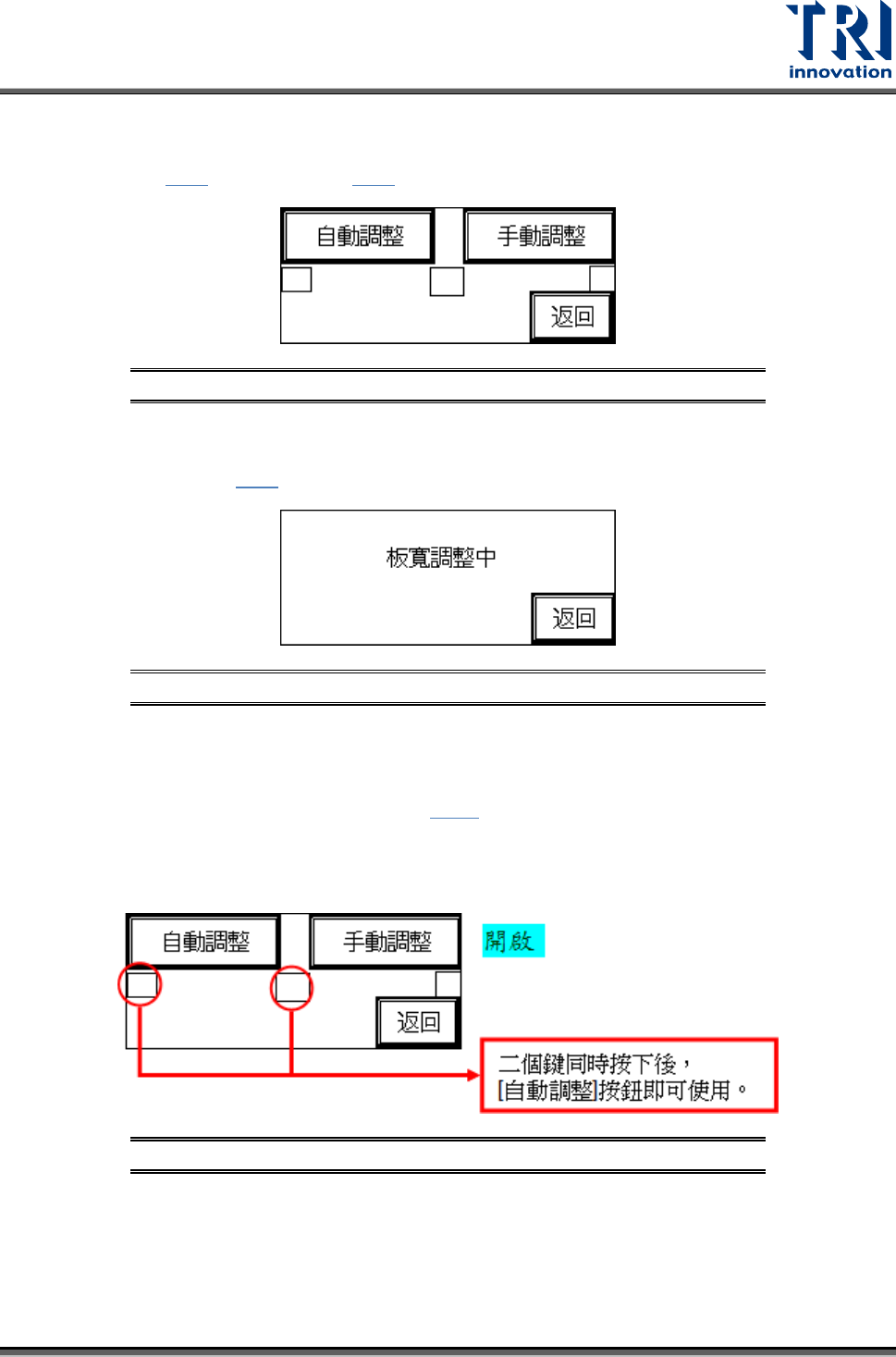 Test Research, Inc. 8 TR7007M SII User Guide – Hardware 圖 11 : 其他設定 – 板寬 設定 – 隱藏 鍵 – 開啟  自動調整:按下 圖 9 中的 [ 自動調整 ] ,板寬會先作歸原點 ( 機械原點 ) 的動作,若為 出廠初次設定時,歸原點完成後,需先設定 ( 電氣原點 ) ,在 圖 12 中 的原點會閃爍, 此時可按 [ 加寬 ] 或 [ 縮小 ] 設定該機種的最大可測板寬…