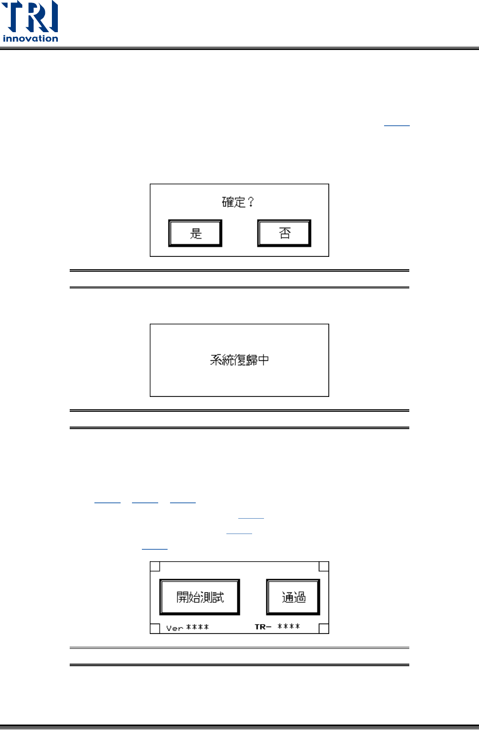 Test Research, Inc. 16 TR7007M SII User Guide – Hardware 3.1.5 復歸 按下 [ 復歸 ] 後,畫面會出現詢問視窗,復歸完成後進入開始測試。 復歸確認:按下 [ 是 ] ,即會做復歸動作,並且畫面會顯示系統復歸中 ( 圖 36 ) ;若按下 [ 否 ] ,則會跳回前畫面。第一次開機或系統緊急停止後,復歸動作, X- Y TABLE 會 回至原點, PCB 會送至出口端 ( …