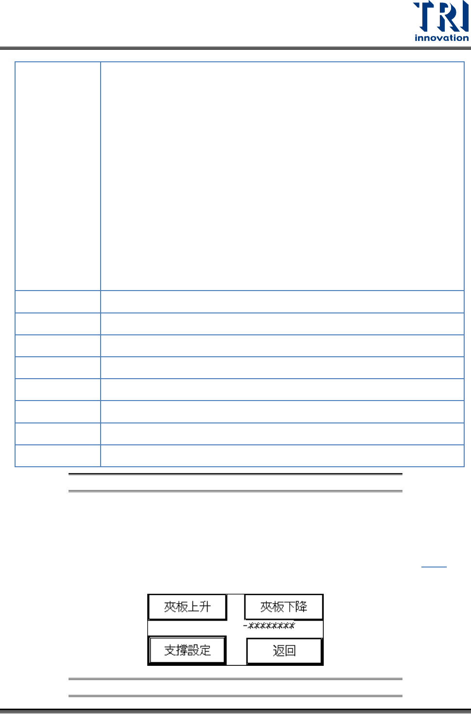 Test Research, Inc. 24 TR7007M SII User Guide – Hardware 支撐設定:將待測板放在進板 Sensor 處,然後按 [ 輸入 ] ,待測板會進入到定位,再 按 [ 上升 ]/[ 下降 ] 按鈕,寸動調整上 / 下,首先需調至下限位置 ( 下限指示燈亮 ) ,然後按 下歸零,再按 [ 上升 ] 調至待測板所要支撐的位置,如下 圖 58 所示,同時在 [- ****** ] 處 顯示設…