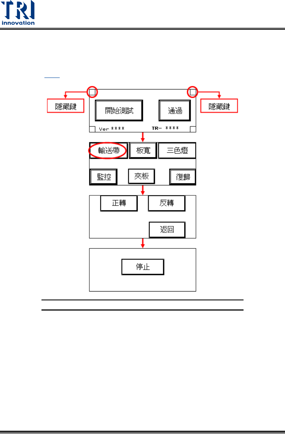 Test Research, Inc. 58 TR7007M SII User Guide – Hardware 9.3 輸送帶 感測器或輸送帶問題:先用手動測試 ( 二個隱藏鍵要同時按,設定步驟如下圖 ) ,觀查其 狀態並參考 圖 98 ,進行故障排除。 圖 100 : 輸送帶手動 測試 9.3.1 Sensor 問題-調整 Sensor 1&2&4 :將待測板置於要調整的 Sensor 上方,用調棒調整 Sens…