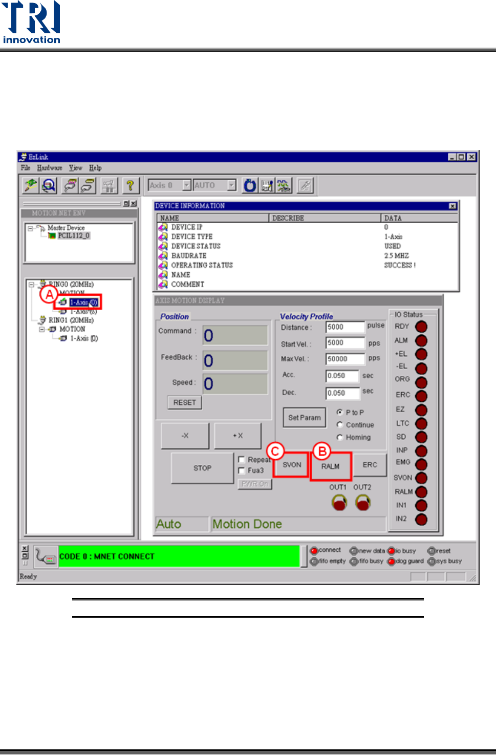 按下[RING1/ 1-Axis (0)]按鈕,開啟 Z 軸動作控制畫面。接下來步驟與 X 軸檢查步驟相