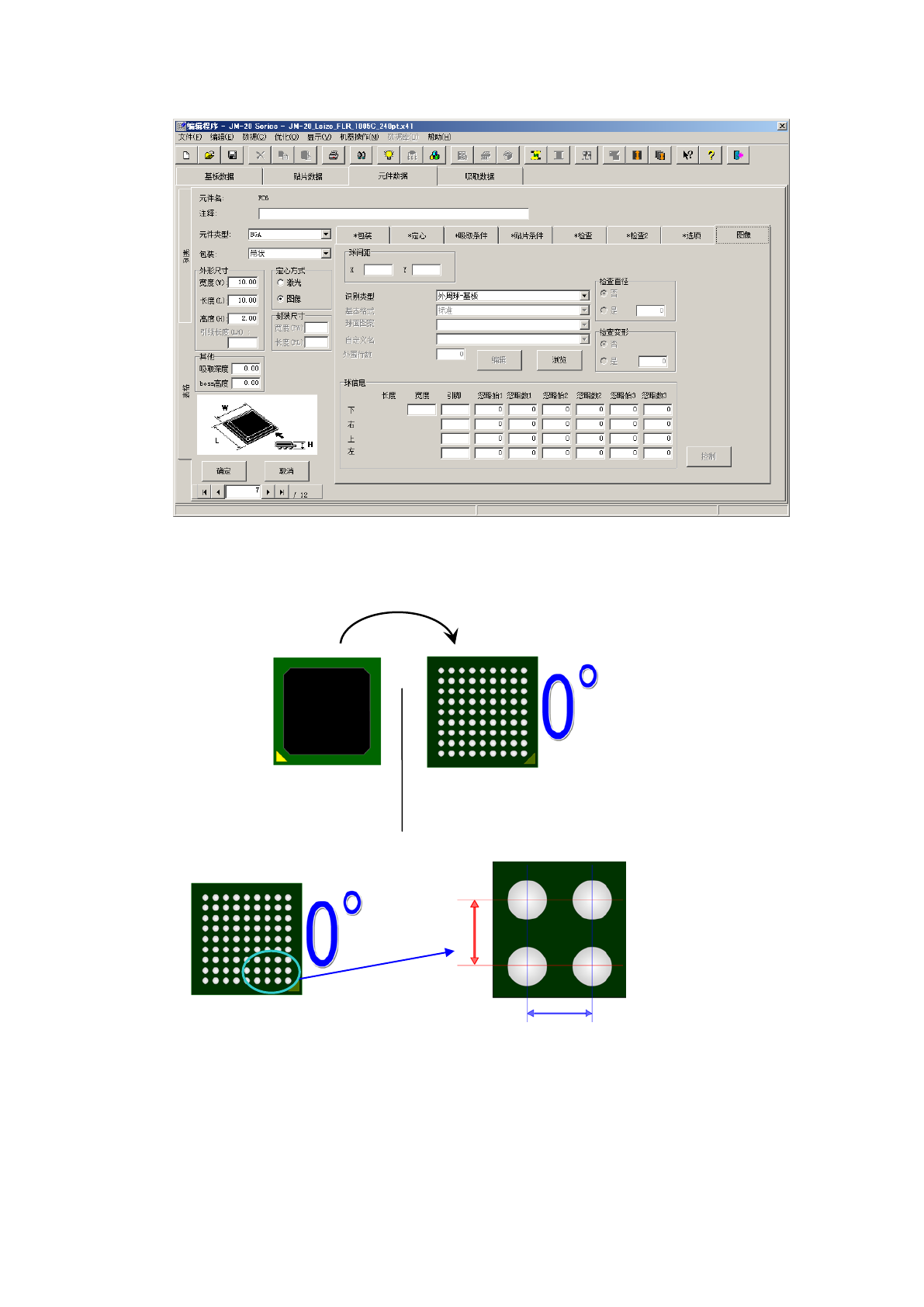 操作手册 Ⅱ 2- 11 6 2) 球信息 a) 宽度 输入球的宽度( 直径) 。 b ) 引脚(数) (下、右、上、 左) 输入相对各个边 外围的球数。 即使外围有欠缺 的球时,也请输 入假定无 欠缺状态时的数 目。 c ) 开始(忽略始) / 缺少(忽略数) (下、右、上、 左) 如果各边的外围 的球有缺少时, 要输入欠 缺少的信息。 缺少信息可分别 在 4 个边上设置, 1 个方 向最多可设置 3 处。 数 开始 1 缺少 1 开…