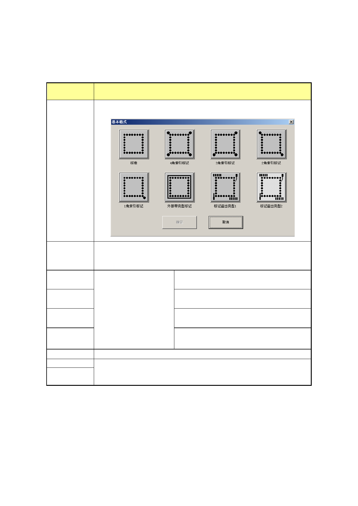 操作手册 Ⅱ 2- 11 8 4) 基本格式 基本格式仅当 “ 识别类型 ” 为 “ 所有球 ” 或 “ 所有 Land” 时,才能设置。 通过对图 像定心时 造成妨碍的 球以外的发光 部分的信 息进行设置, 可将其作为 「 识别对象外 的反射物 」 排除在识别对象 以外。 基本格式 选择项目一览 内容 浏览 显示标准~标记 溢出的样本图形 。 也可从显示的画 面中选择基本格 式。 标准 包装外围只有球 。 原有的 B GA 小间距、小…