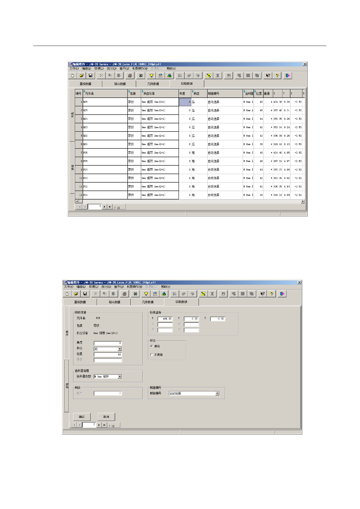 可在表格画面中编辑“角度”、“供应”、“位置”、“通道”、“吸取坐标”、“状态”、“供料器类型”、“剩余”、