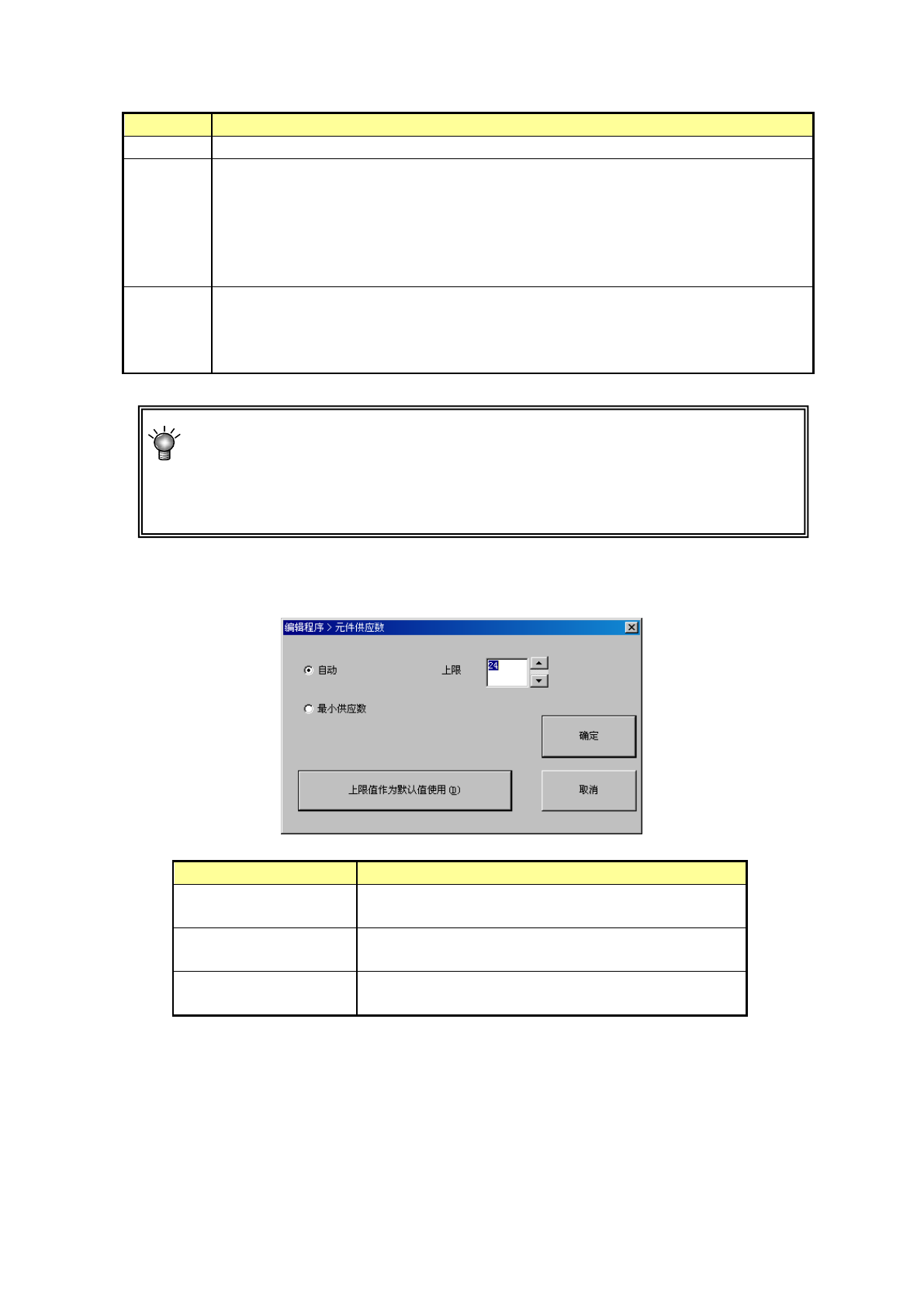 操作手册 Ⅱ 2- 148 (2 ) [ 变更 ] 按钮 对各元件的供料 器 供应数进行 设置 。 设置项目 内 容 自动 对指定的元件的 供应数设置为自 动。 在初始化中设置 的上限内进行供 料器数的 优化。 可无限使用元件 的卷数托盘数。 手动 手动变更供应数 。 按所设置的供应 数进行供料器或 托盘配置 的优化。 输入供应数