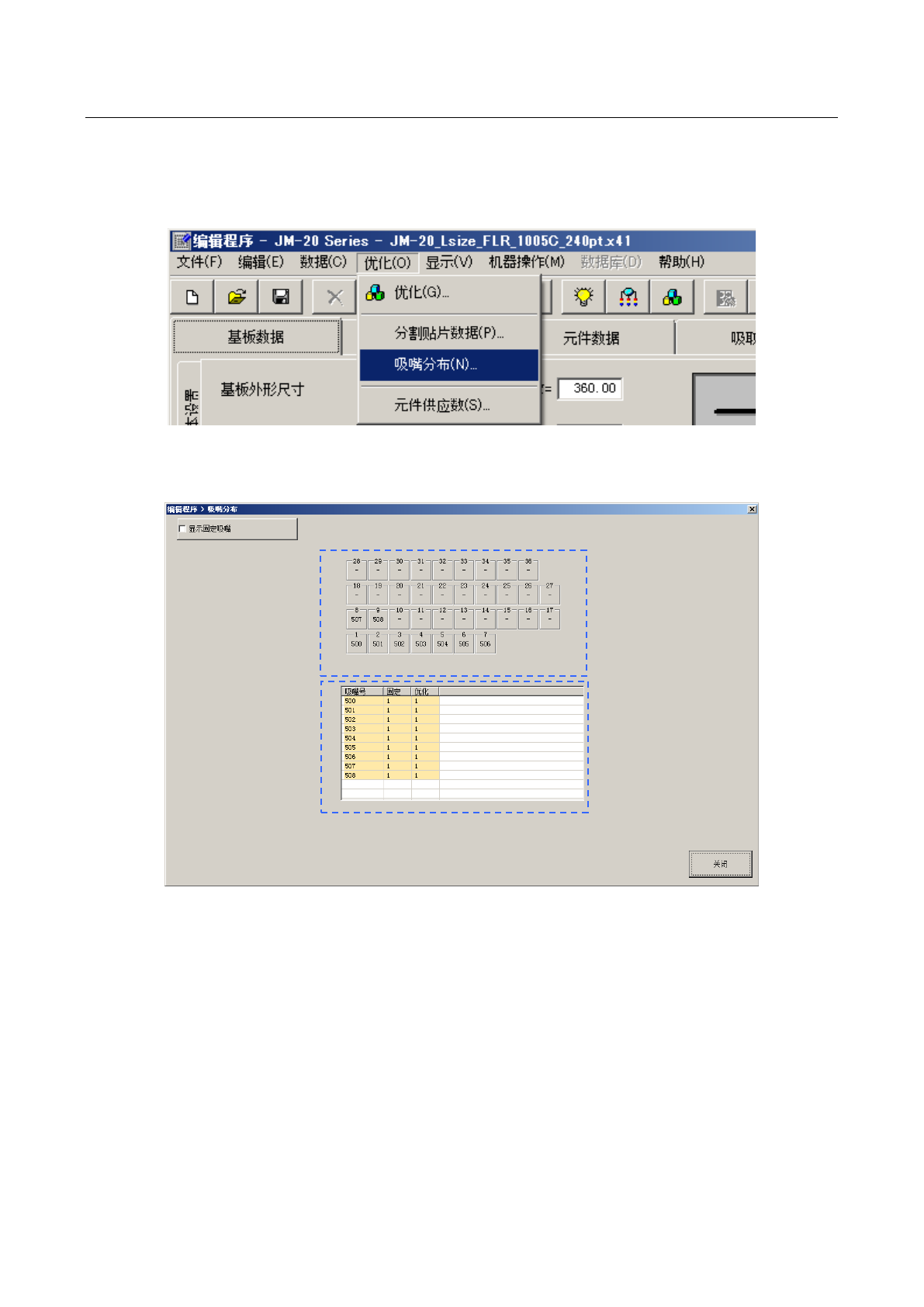 执行优化后,可安排该机种可使用的定心方式、吸嘴编号。