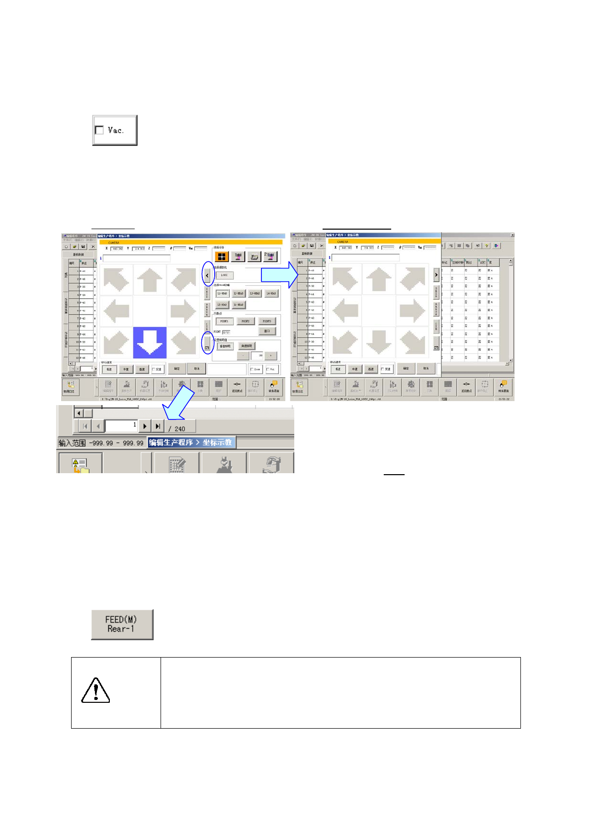 操作手册 Ⅱ 2- 188 8) V ac. 使用 H ead 进行 示教时,可以 控制真空 ON/OFF 。 按 “ Va c . ” 复选框,当已经 打开真空时, 在复选框 中会打勾。 9) 方向按钮 通过点击按钮, 可以将轴向 8 个方 向进行移动。 10) 最小化按钮 按 [<] 按钮 ,右侧画面会 消失。 再按一下 [ > ] 按钮 ,会恢复原 来的尺寸。 点击 [ _ ] 按钮 时,示教画面会 缩小为图 标, 并移动到…