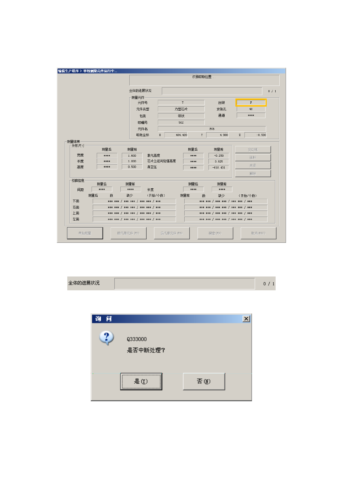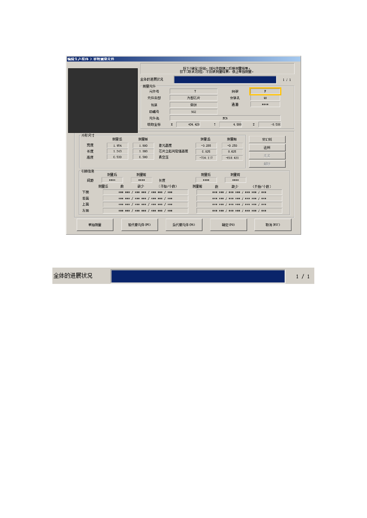 在单独测量过程中,显示如下画面。显示正在进行单独测量的元件的内容及吸取位置,并依次显