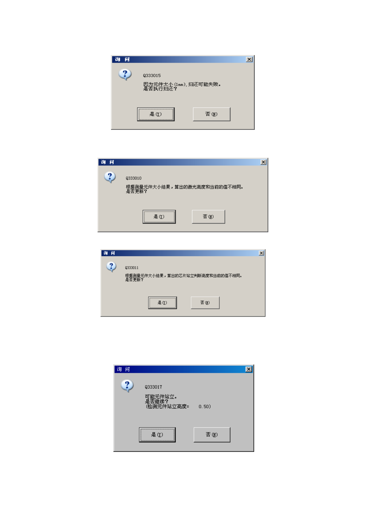 根据尺寸计算出的激光高度或芯片站立判定高度与原来的值不同时,显示如下询问。