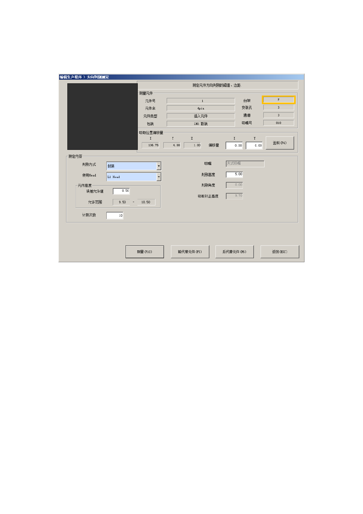 操作手册 Ⅱ 2- 243 c ) 测量 内容 显示 元件方向判别 设定中所 设定的内容 。 变更内容 并执行测量 时,变更的内容 会得以反映 。 ● 判断方式 从引脚、封装、 倒角中 进行指定。 ● 使用 贴片头 可以选择 测量 所使用的 贴片头 。 ● 测量次数 可以选择 测量的次数 。 ● 吸嘴种类 显示 使用的吸嘴类 型 。 ● 判断高度 可以设定以元件 下面为基准的 元件判断 高度。 ● 判断角度 可以设定以吸取 时的角度为基…