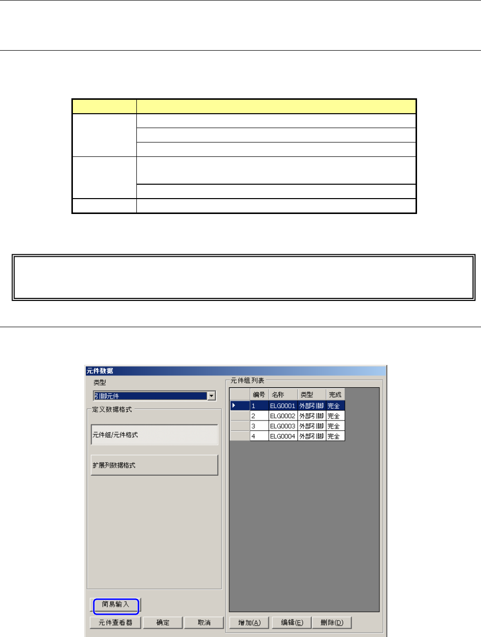 在元件要素数据画面中选择了元件要素的“类型”后,再选择「简易输入」,则显示元件要素组