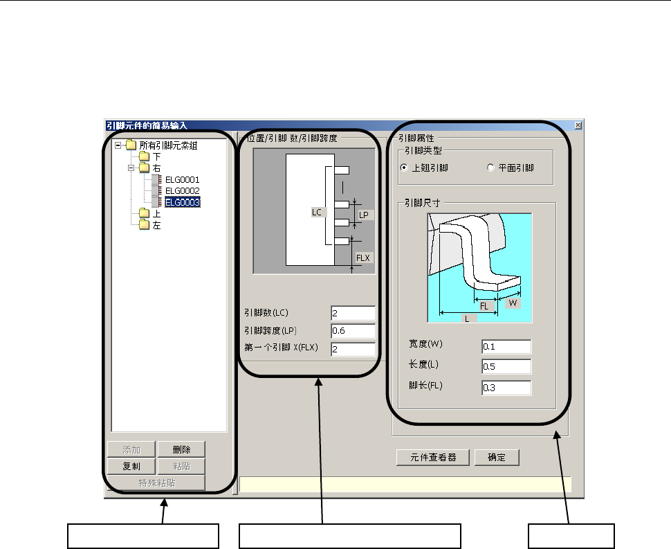 ◆引脚元件简易输入画面由“引脚元件要素组一览”、“引脚位置、引脚数、引脚间距”、