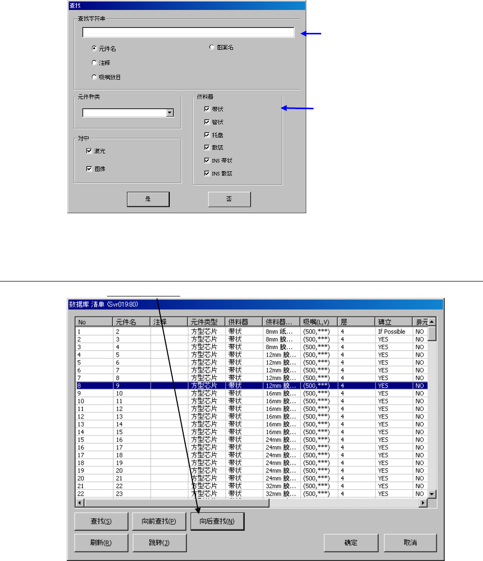 操作手册 Ⅱ 4-6 4-1- 3 命令列表 从贴片数据、 元件数 据中选择时, 在贴片 数据上尚未输入 元件名的状态 下, 可选择命令列表。 元件名 已输入的状态下 ,则不能执行。 元件名已经输入 时,显示为不能 选择。 执行方法,请参 见「 4-1-1 数据库使用方法」。 4-1-3- 1 查找 可以查找元件数 据库内的数据。 < 步骤 > ① 从数 据库清单画面 ,点击 [ 查找 ] 。