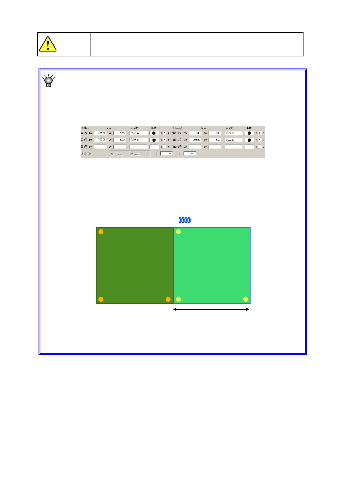 操作手册 Ⅱ 2- 16 注意 为避免人身伤害, 示教时切勿将 手放入装 置内部,也不要 将脸和头靠近 装置。 使用长尺寸基板 对应( L 规格: 选购项 , XL 规格:标准 )时 在对基板外形尺 寸 X 超过规定尺寸的 大型基板时, 设置第 1 次夹紧贴片范围的 B OC 标记 ( 以下称为第 1 号 B OC 标记 ) ,和第 2 次夹紧贴片范围的 B OC 标记(以下称 为第 2 号 BOC 标 记 )。 ※ 使用长尺寸基 板对…