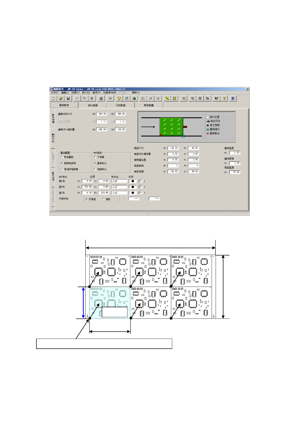 ②设置基板位置基准和电路原点,输入电路数和电路间距的信息。