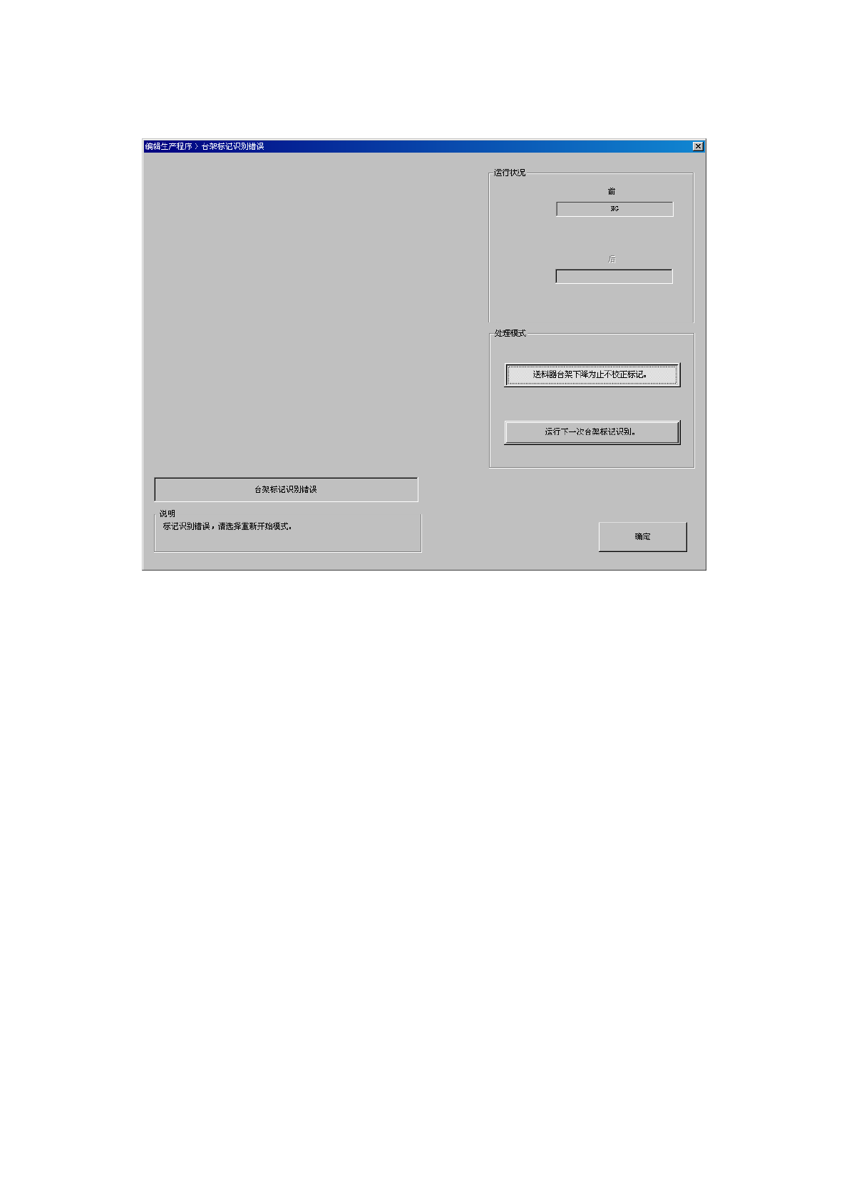 当识别台架标记失败,画面的[说明]栏显示提示信息时,可以选择[处理模式]的项目。