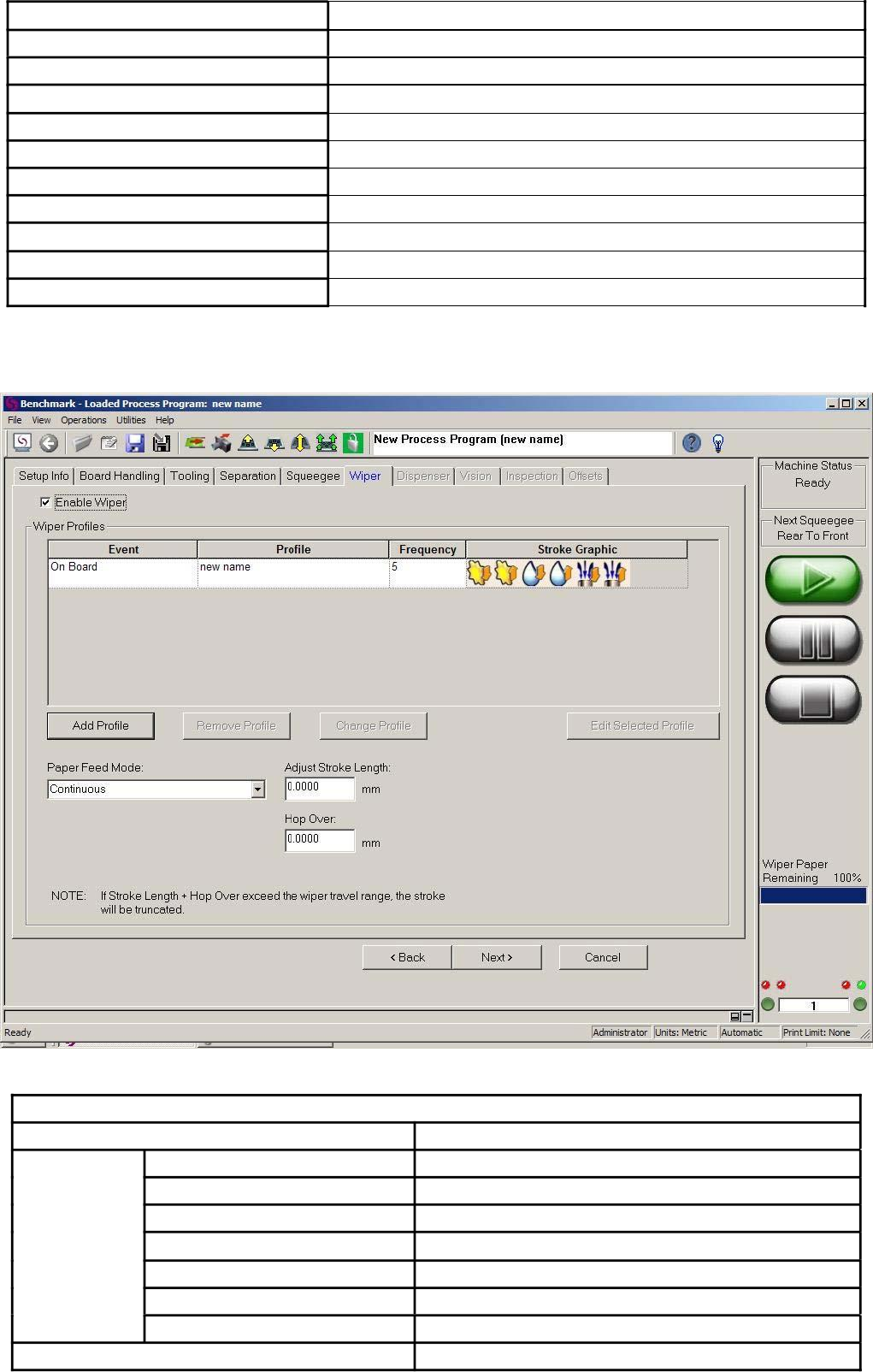Enable Recovery Knead Idle Time (Recovery Knead) Strokes Speed Use Knead Dialog Timer Enable Rejection Knead Idle Time (Rejection Knead) Strokes Speed Align Board Use Knead Dialog Timer 4.9. Wiper :擦拭功能 设定,相 关设定说明 如 下: 表…