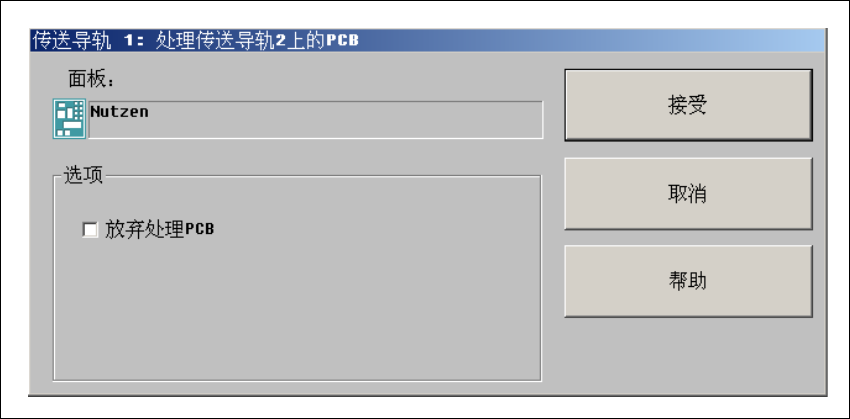 “传送导轨 1:PCB 在输入传送导轨上”对话