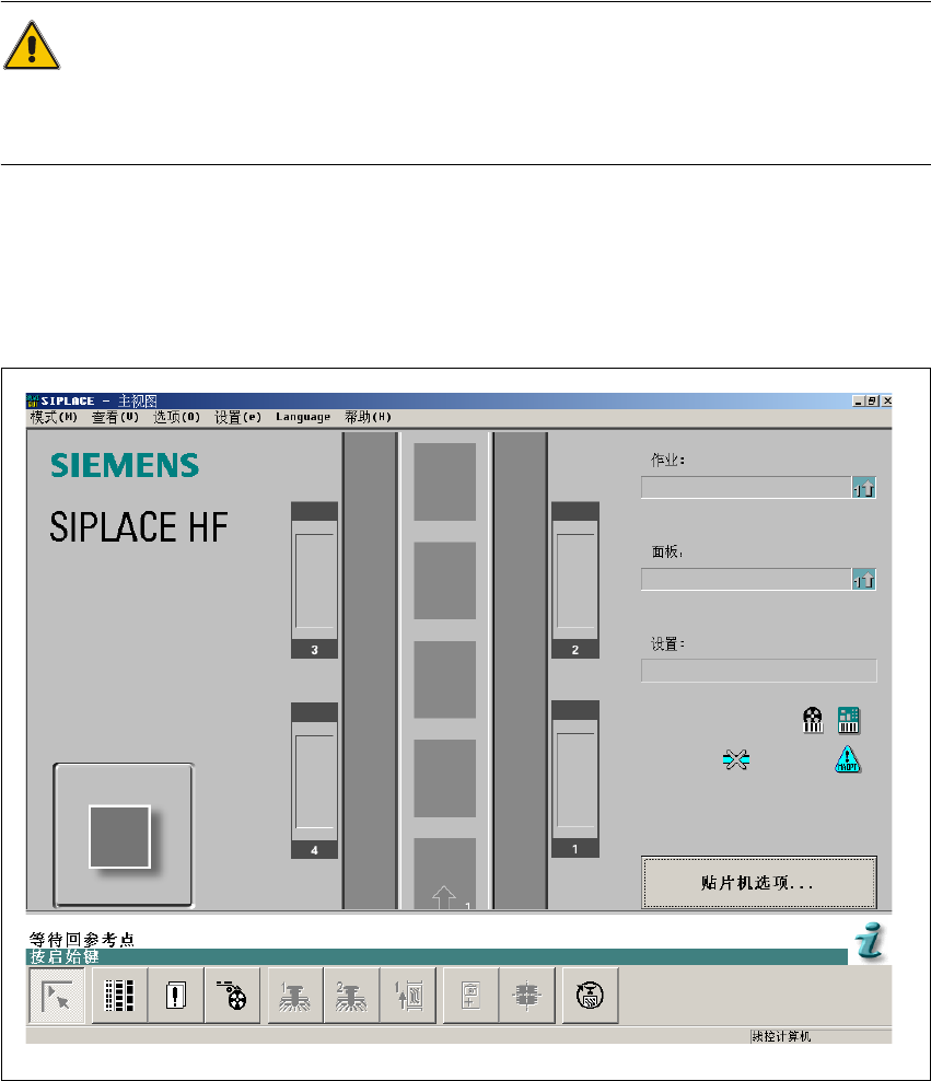 SIPLACE 软件指南 SR.504.xx 4 SIPLACE 生产线的接通和关闭 2003 年 1 月版 4.1 接通 SIPLACE 生产线 51 4.1.3 接通贴片机 / 启动站计算机程序的用户界面 小心 只有在 SIPLACE Pro 计算机上的线控 GUI 已启动且作业已下载完成后,才能打开 贴片机。 现在,可以进行回参考点,否则 ,贴片机将 “等待与 SIPLACE Pro 连接” 。 4 Æ 从主电源开关上接通贴片机,…