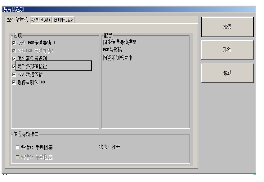 要操作可跟踪性或元件检验,必须激活贴片机选项中的 “Comp. verification with barcode (元件