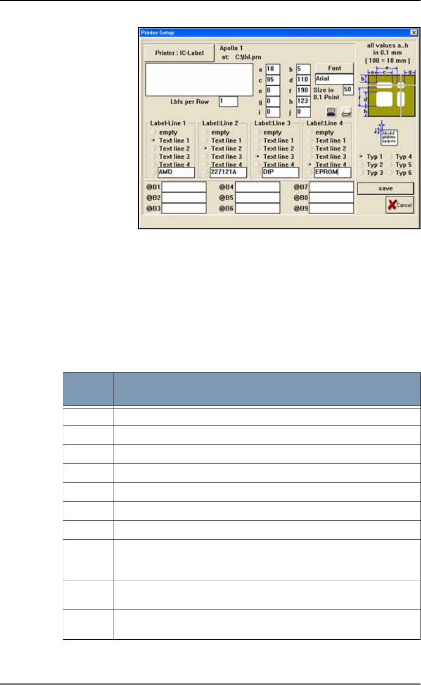 ■ Printer Options ◘ (Optional) Creating a Label Printer File PS Series Owner’s Manual 3—61 back Figure 3-5 1: The Label Print er–Setup Wind ow . Each label type has different values for d imensions a t o j. Up t o four l…