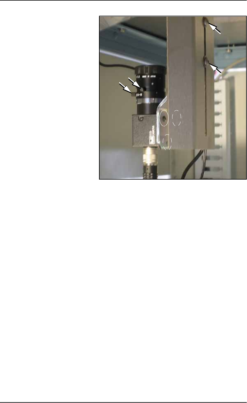 Maintenance ■ T he Vision System 4—50 Data I/O • 981-0424 -002 back Figure 4-4 7 : Camera mounting screws and f ocus ring knobs. Dashed ov als indicat e screws hidd en in this vie w . 2c. Check the two lens focus-ring th…