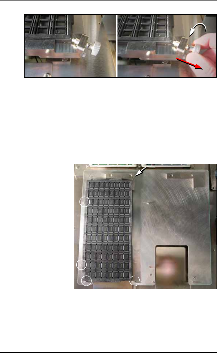 Figure 2-6: Push trays snug against index pins (circled). Extra pins are