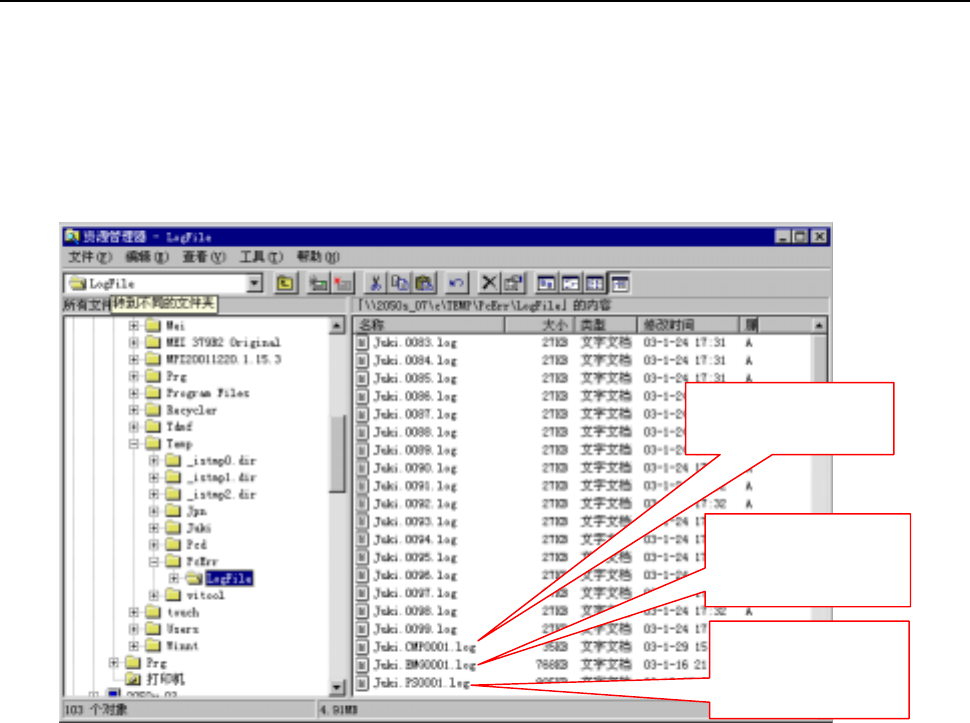 故障检修 记录 工具 2-3 2-2-2 生产停止前的自动记录取得 停止前的生产张数按1 00 张自动保存为记录文件。 2-2-2- 1 记录的保存地点 文件名为“ Juki . 生産 枚数 .log ”的记录 文件自动保存 在「 C: \ Temp \ PcErr \ Lo gFile 」下。并且, 制作“ Juki. 生産张数 .log ”文件以外的以下三个文件。 2-2-2- 2 记录的删除 若切换生产程序,根据“ Juki.00…
