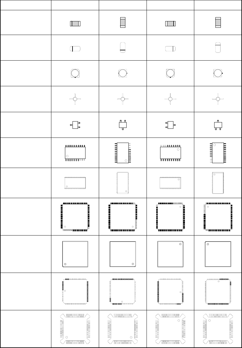 第 4 章 生产程序制作 Rev03 4-40 ④ JUKI的元件供给角度定义 表 4-3-5-2-2 用图解方式说明了元件供给角度 0°的定义及各个角度。 对于没有极性的元件,无需区别 0°与 180°、90°与 270°。 表 4-3-5-2-2 JUKI 的元件供给角度的定义 元件种类 0 ° 9 0 ° 180 ° 270 ° 方型芯片 圆筒型芯片 铝电解电容器 GaAsFET SOT SOP HSOP SOJ QFP QFN …