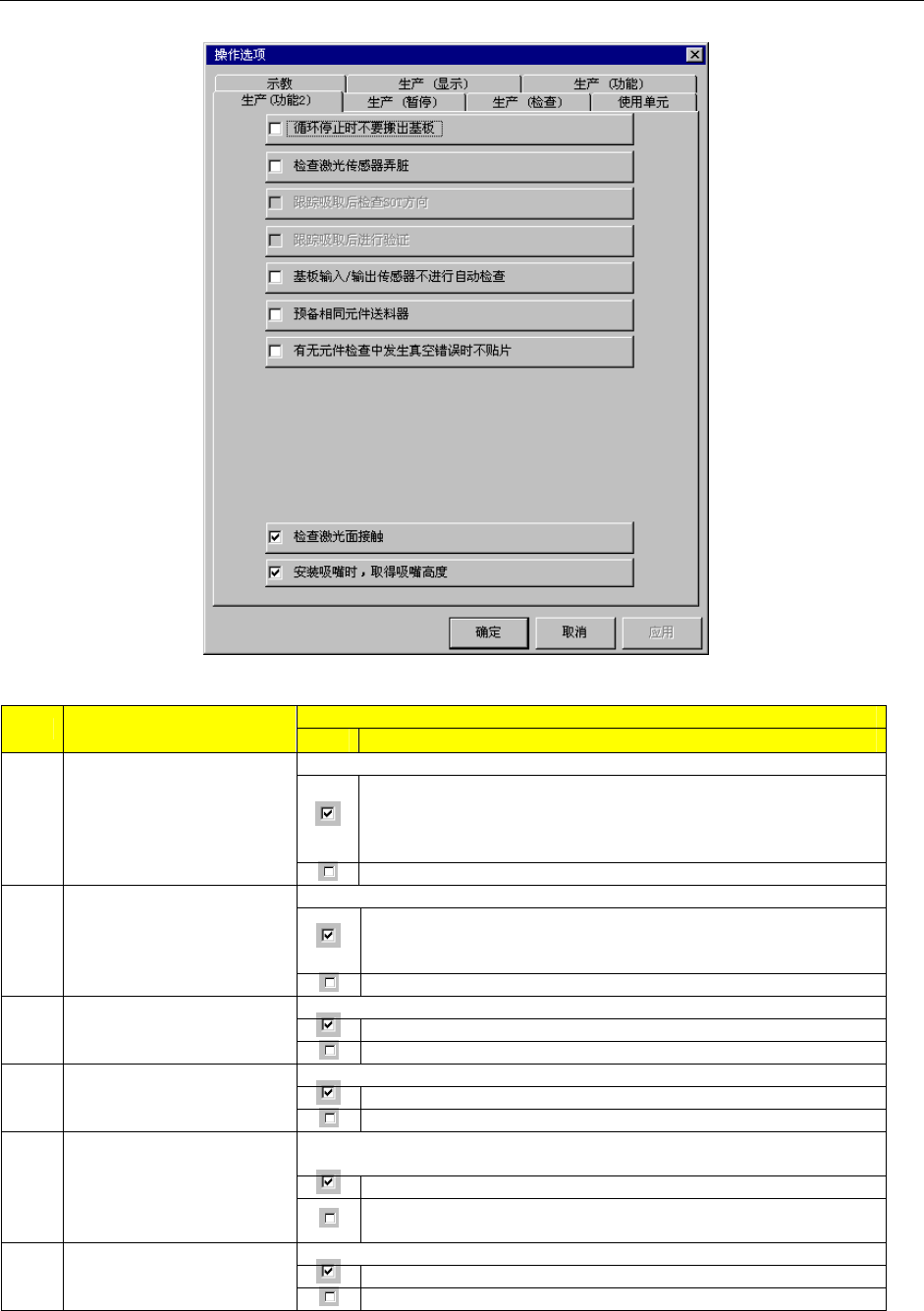 第 5 章 其它功能 Rev03 5-30 5-2-2-4 生产的功能 2 选项的设定 设定生产时的操作。 图5 - 9 生产的功能 2 选项 内容 序号 项目 状态 运行及详细内容 设置在循环停止时是否搬出基板。 在生产中按下单循环键时, 生产一块基板后不搬出基板, 留 在中心站上。 ·解除基板固定并暂停。 ·按<START>键,再进行生产。 1 循环停止时不要搬出基 板 把基板排出到后道工序 后结束生产。 设置基板送入时…