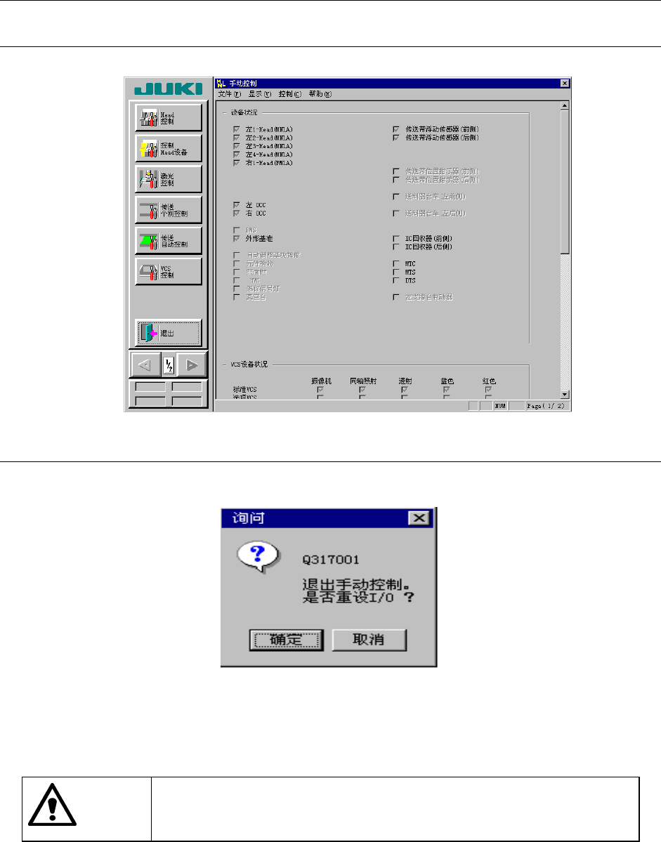 第 5 章 其它功能 Rev03 5-67 5-5-2 手动控制的起动与结束 5-5-2-1 手动控制的启动 从菜单栏中选择“设置”/“手动控制”,显示如下的手动控制初始画面。 图 5-4 1 手动控制初始画面 5-5-2-2 退出手动控制 如果从菜单栏中选择“文件”/“退出”,或选择命令按钮的“退出”,则显示退出的确认画 面。 图 5-4 2 安全方向设定的确认画面 “确定”:执行I/O安全方向设定后可退出。例如,贴片头带有吸嘴时,将…