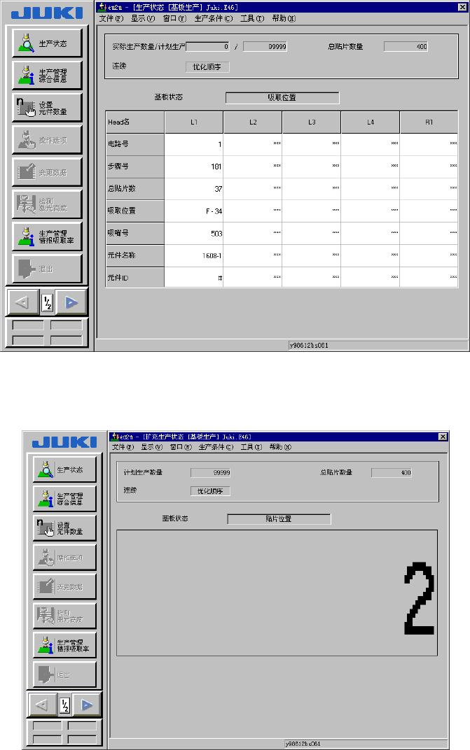 第 2 章 生产 Rev03 2-30 2-8-3-1 生产状态 按下<START>开关,生产开始后,画面中显示生产状态。 画面显示根据“工具”/“操作选项”的“生产(显示)”标签的设定(是否选中“用大号字体 显示生产基板的数量”)而不同。(参见5-2 操作选项) ◇ 通常的生产状态显示画面 图 2-24 生产状态显示画面 ◇ 当在操作选项的“生产(显示)”标签中选中“用大号字体显示生产基板数量”项时。 图 2-25 生产状…