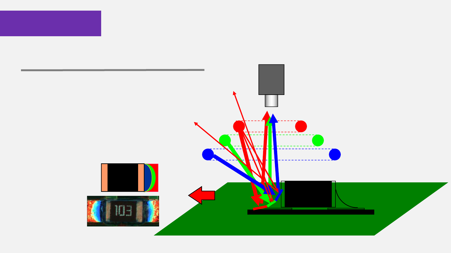 CCD 将3D信息转 换为2D图像 三色 环形光的照 射,使坡度不同的 焊点部位显 示不同的颜色. 光学原理 红绿 蓝三种不同颜色的光在 不同梯度上呈 发生镜面发射 ,使坡度不同的焊点 部位显示不同 的颜色。 三色光原理