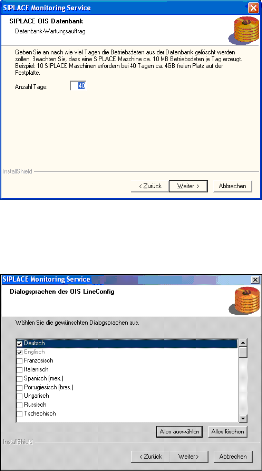 ¾ Legen Sie fest, für wie lange die Betriebsdaten in der Datenbank gehalten werden sollen.