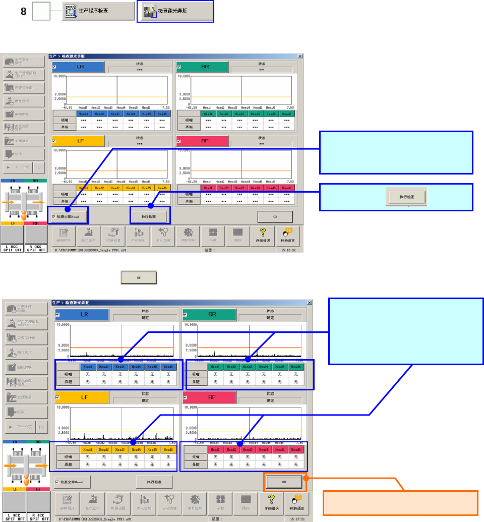 操作手册 I 2- 29 <步骤 2 > 检查激光弄脏 ① 请按下按钮「检查激光弄脏」 。 ② 显示「检查激光弄脏」画面。 ③ 清扫后,请按下按钮 ,确认没有「弄脏」 。 通常情况下请勾选 「检查全部 Head」 。 请按下按钮 发现“弄脏”时,请按 照『操 作手册 II 』 的 「第 5 章日常检查」 的说明,清扫激光单元。 确认后,按下按钮「OK」 。