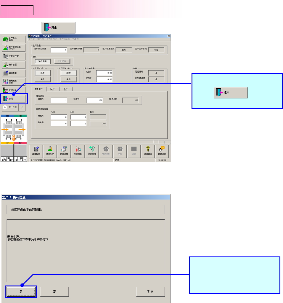操作手册 I 2- 32 ① 按下按钮 。 ② 没有保存生产程序时,会显示「确认信息」画面。 从命令按钮中选择 按钮 。 Step7 结束生产画面 选择「是」后,生产中变更的 程序和生产管理信息即可保存 下来。