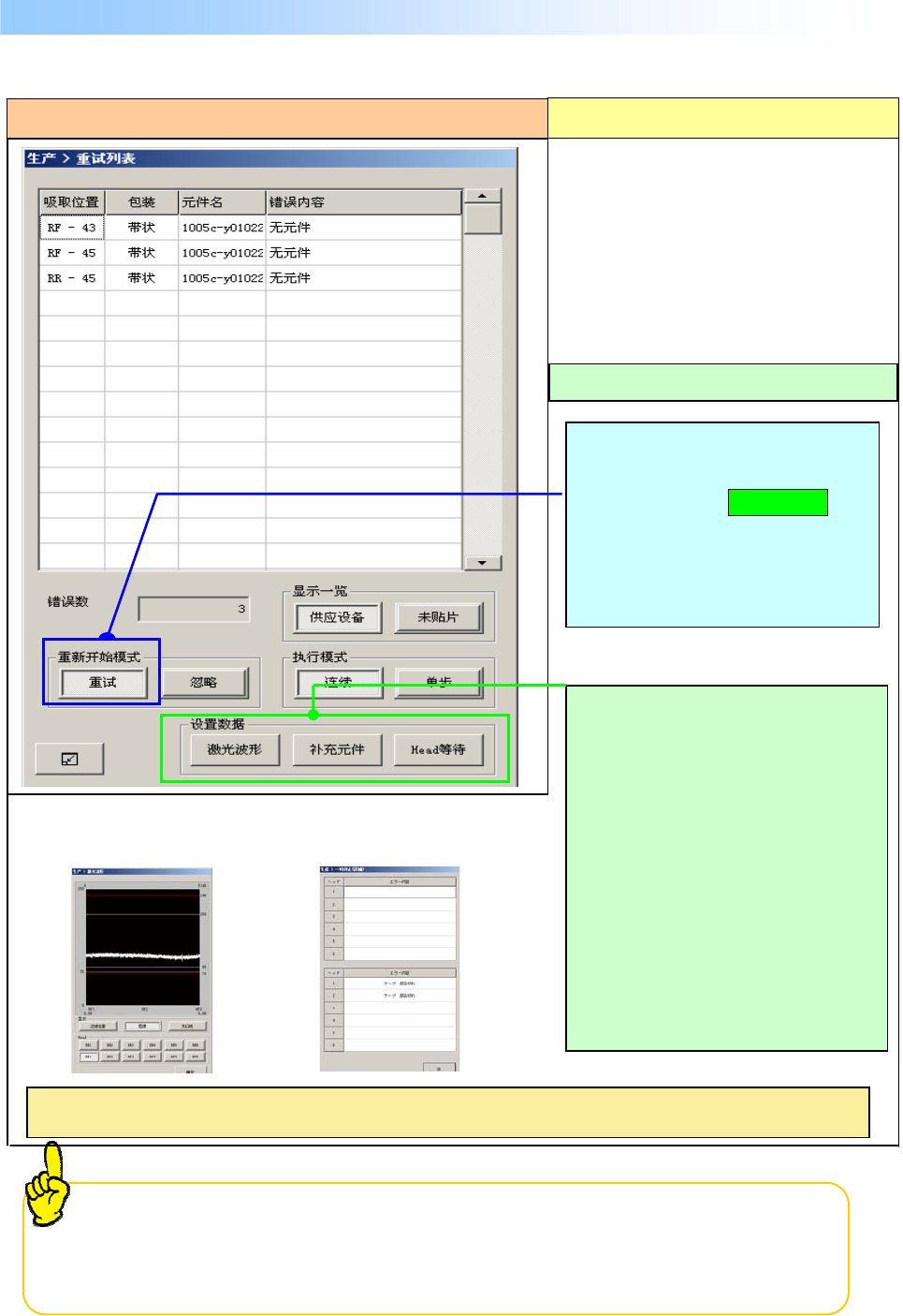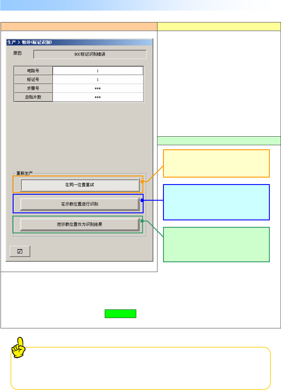 操作手册 I 3- 3 BOC 标记、基准领域标记识别错误时,显示如下画面,装置暂停。 发生错误的画面 错误的原因,原因 ① BOC 标记弄脏。 ② BOC 标记检测框内没有标记。 ③ BOC 标记坐标数据输入错误。 ※基准领域标记也发生同样的错误。 处理错误的方法 ①选择按钮「功能栏」/「示教」 ,进行标记中心的示教。 ②示教后,即可选择「重新开始生产模式」 。 ・ ③判断标记状态(形状 弄脏) 、标记是否在检出框内后,进行选择。 请…