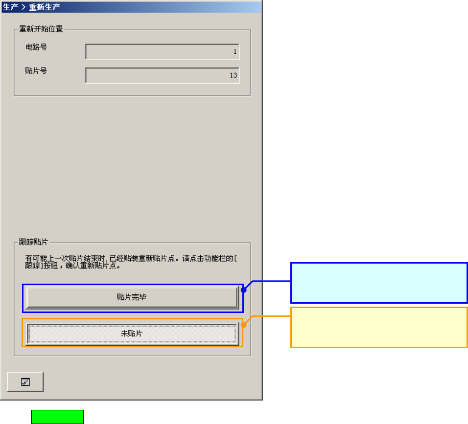 操作手册 I 3- 13 生产开始、再加紧基板后,会显示如下画面。 请通过叠加画面确认贴片点是“贴片完毕”还是“未贴片” 。 请按功能栏的[跟踪]按钮进行确认。 : 请按下 开始开关 ,开始继续生产。 重新开始的贴片点已经贴片完 毕时,选择此项。 重新开始的贴片点未贴 片时, 选择此 项。