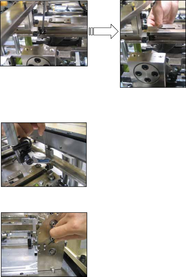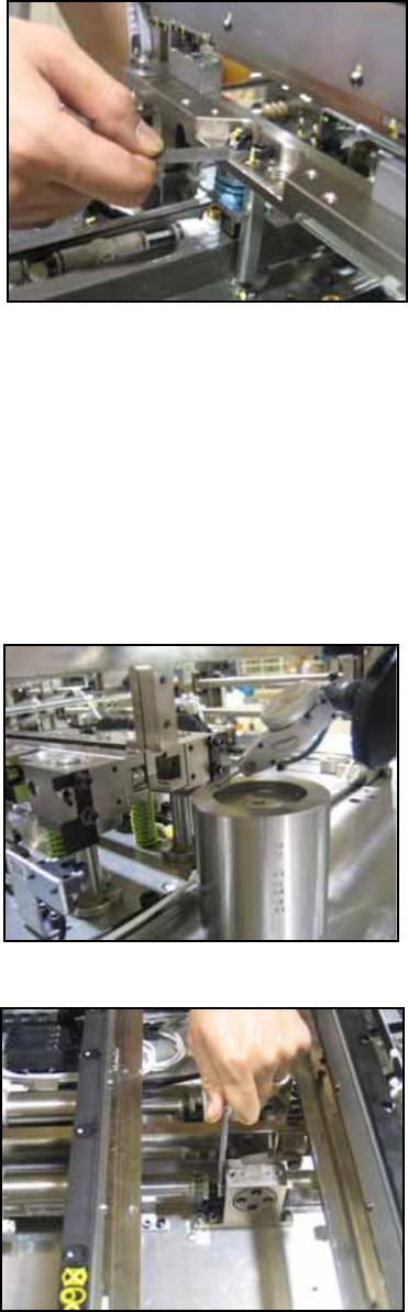 4. Also if the tilt of the cam follower rail is more than 0.1mm the set bolt can be used to adjust it. 5. Old type conveyor back up plate height setti ng. Similarly bring the dial gage from the head. Use jig (PM06320). L…