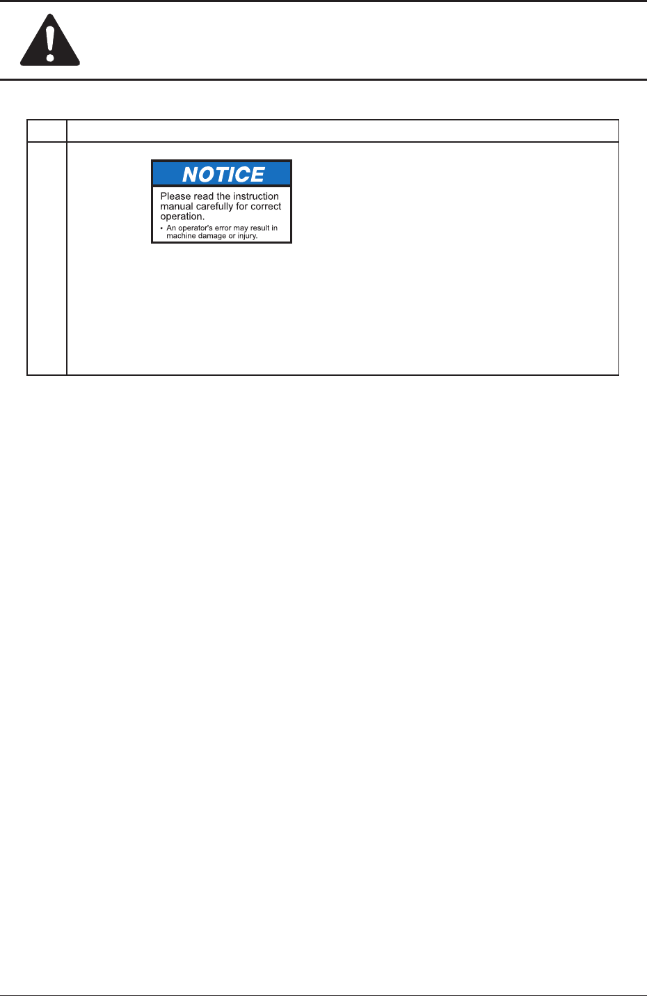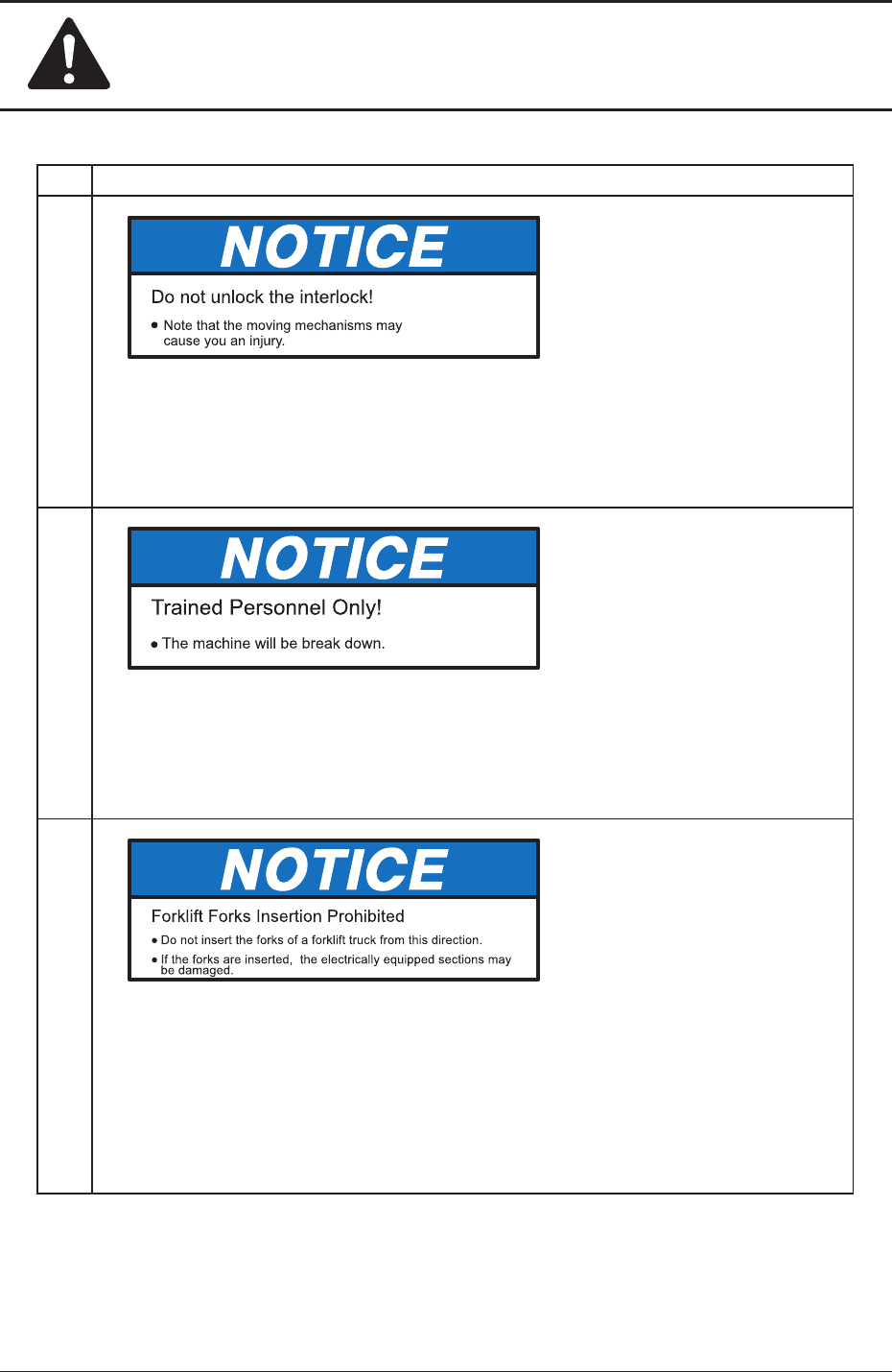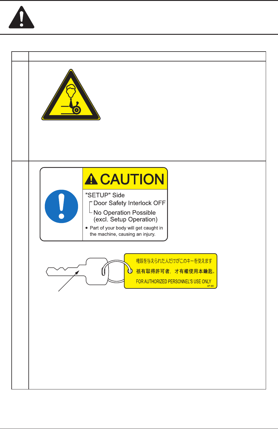 Safety Precautions Safe-26 AKOE-ID No. Alert Labels and Description (17) Description Do not unlock the interlock. Otherwise, the moving mechanisms may cause you an injury . (18) Description Only trained personnel sho…