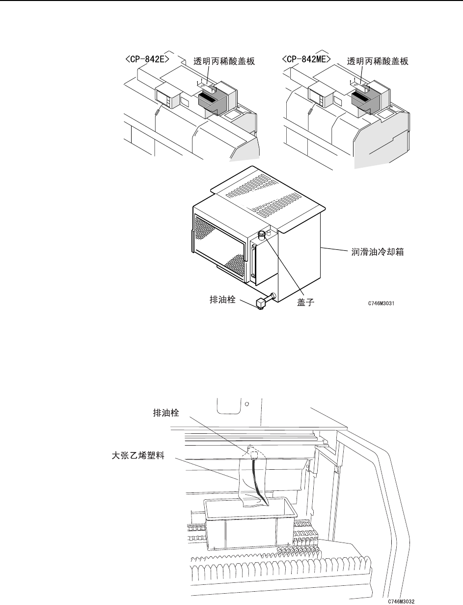 注意 )1.在排放润滑油时,请仔细的将机器覆盖好,以防润滑油洒落在机器上。