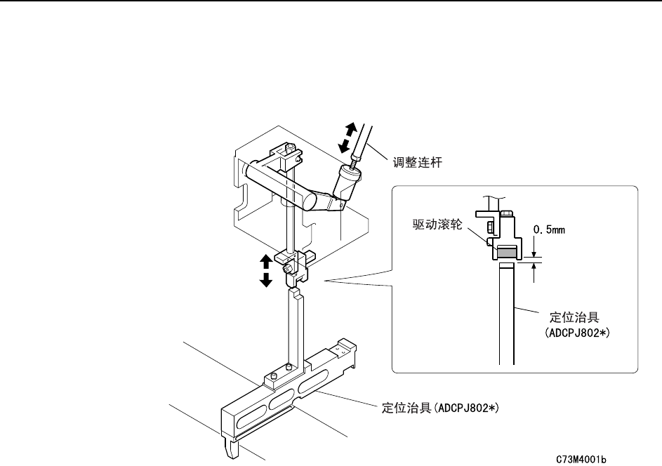 6 转动调整连杆,将定位治具的上端和驱动滚轮之间的间隙调整为 0.5 mm。
