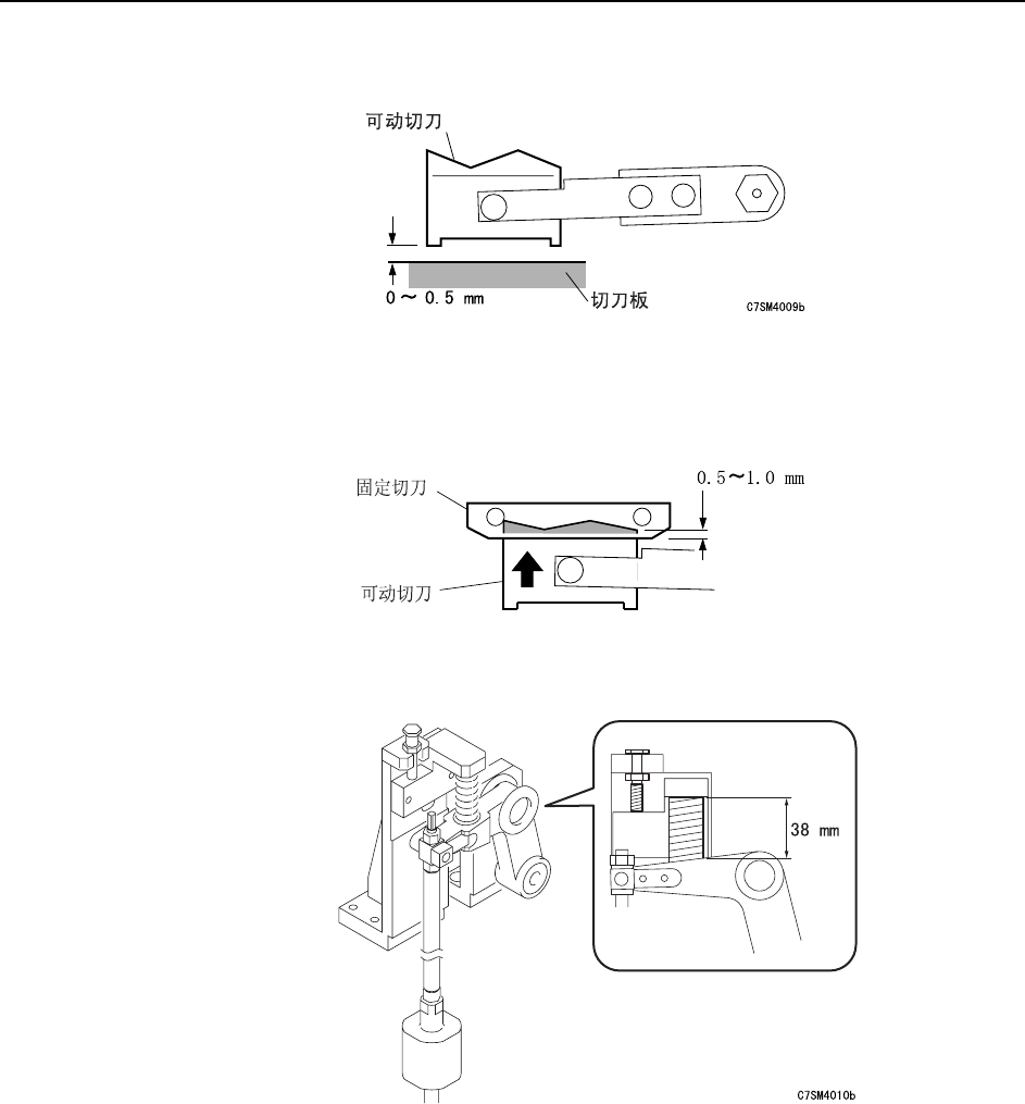 调 整 >> 站的各部 MEC-CP-842-1 .0S 7-5 3 把可动切刀的下方与切刀板下 方的距离调至 0~0.5mm 。 4 请边看凸轮刻度盘边旋转凸轮 手柄,将凸轮角度调节到 194 度。 5 确认可动切刀嵌入固定切刀刀 刃 0. 5~1.0mm 。 6 确认弹簧的长度为 38mm 。 C7SM4008a