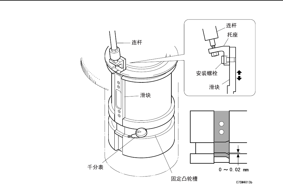 6 确认滑块的凸轮槽与固定凸轮槽的平行度为 0~0.02mm。超 过 0~0.02mm 的范围时,
