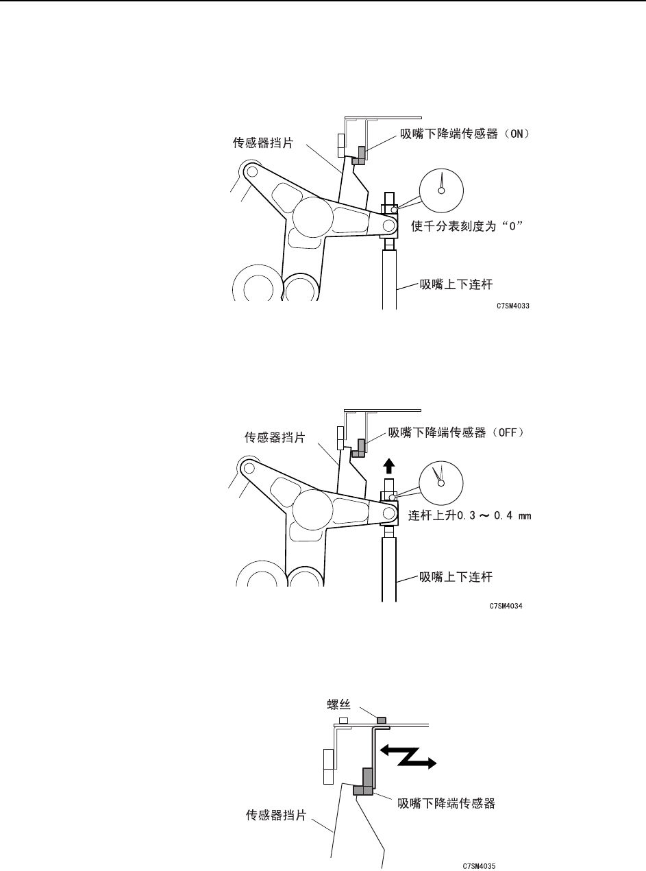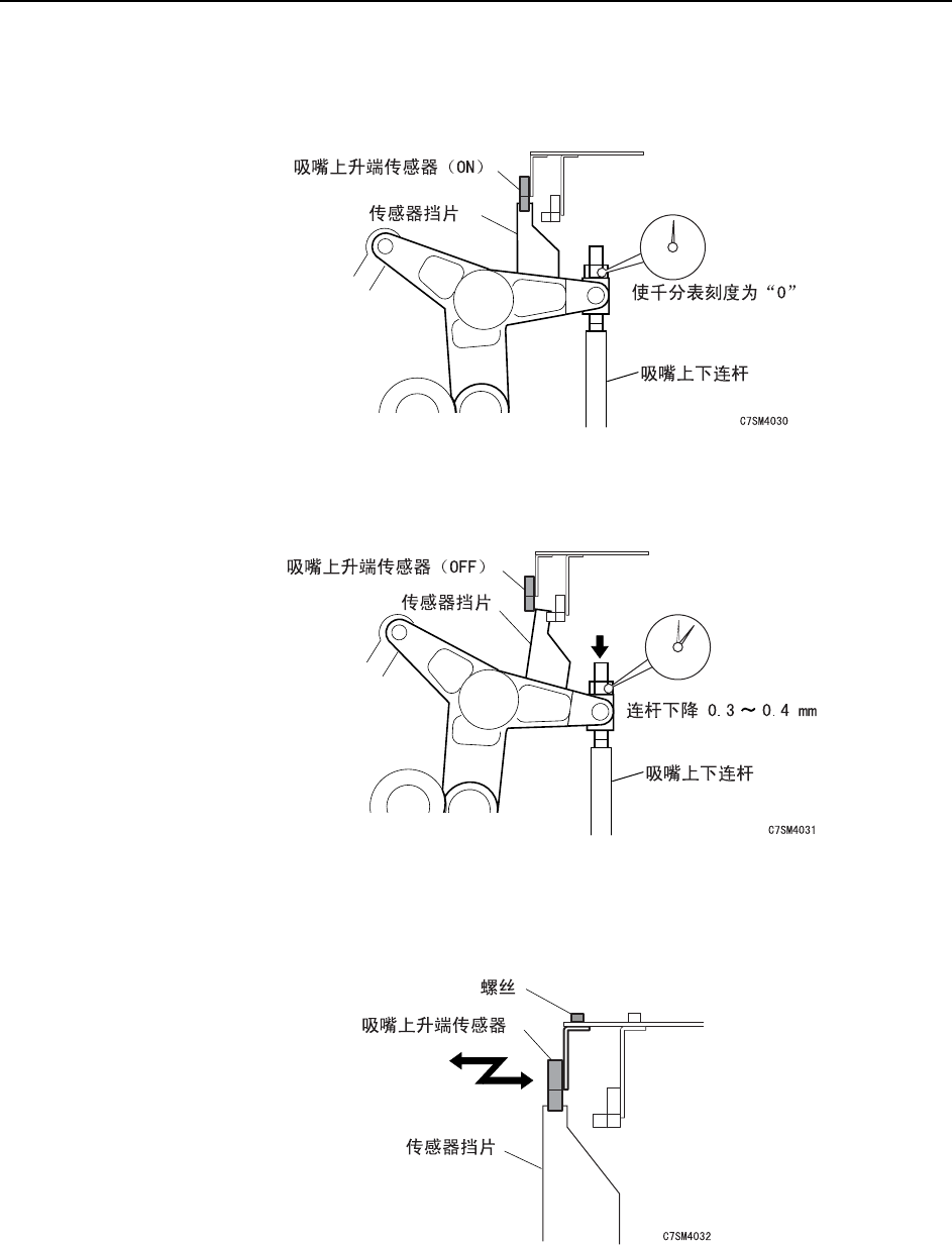 6 边看千分表边将凸轮轴以正方向旋转,使吸嘴上下连杆上升。确定传感器的安装位