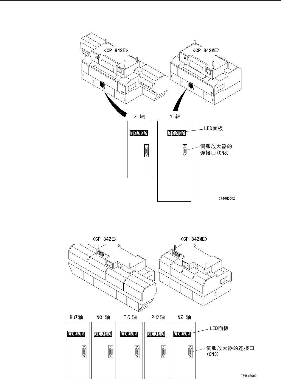 故障排除 >> 有关伺服系统的故障 MEC-CP-842-1 .0S 8-17 8.2 有关伺服系统的故障 采用 AC 伺服系统来控制机器的各驱动轴。万一伺服系统 发生异常就会显示报警编码通知操 作人员。 这里记载了显示的报警编码和检 查,请作为查明原因和解决方法的参 考。 8.2.1 报警编码的显示处 报警编码显示在各伺服放大器的 LED 面板上。 以下表示各轴的报警编码的显示 处。 备注 ) 将附属的数字操作器连到伺服放…