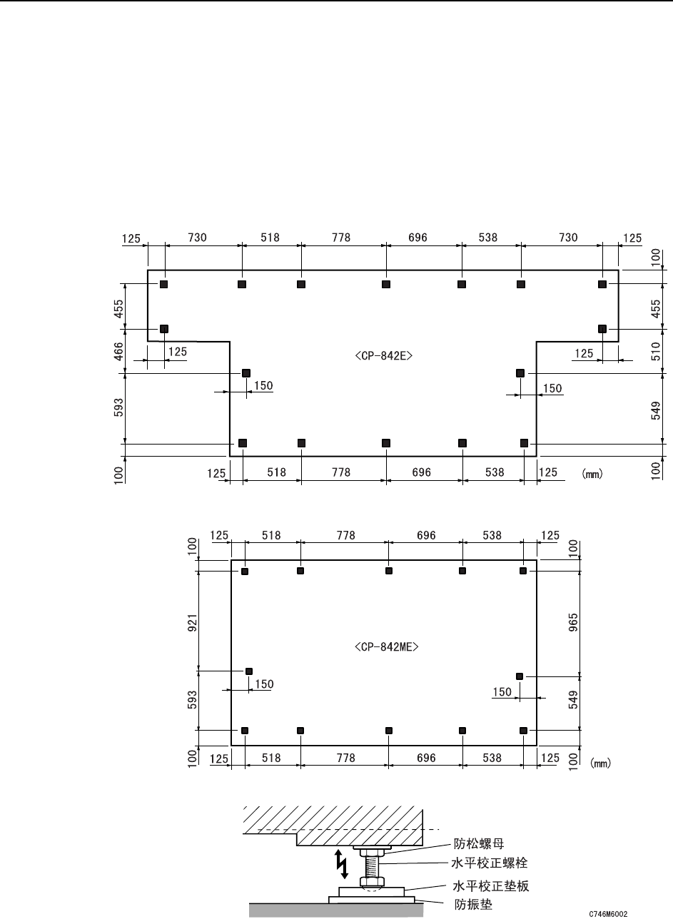 安装 >> 安置 9-2 MEC-CP-842-1.0S 方 法 1 参照下图,配置水平校正垫板或水 平校正块。 2 在机器机座上设置水平仪 (横方向和纵方向) 。 3 旋转各水平校正螺栓进行高度调整 。 4 请在确认电路板搬运高度及机器的 水平度是否正确后旋紧防松螺母。 由于防松螺母 的旋紧,有时水平度会产生改变, 所以,旋紧螺母后需再确认一下机 器的水平度。 参考 ) 请完全旋紧防松螺母,如螺母不旋紧会发生机器振动,有可…