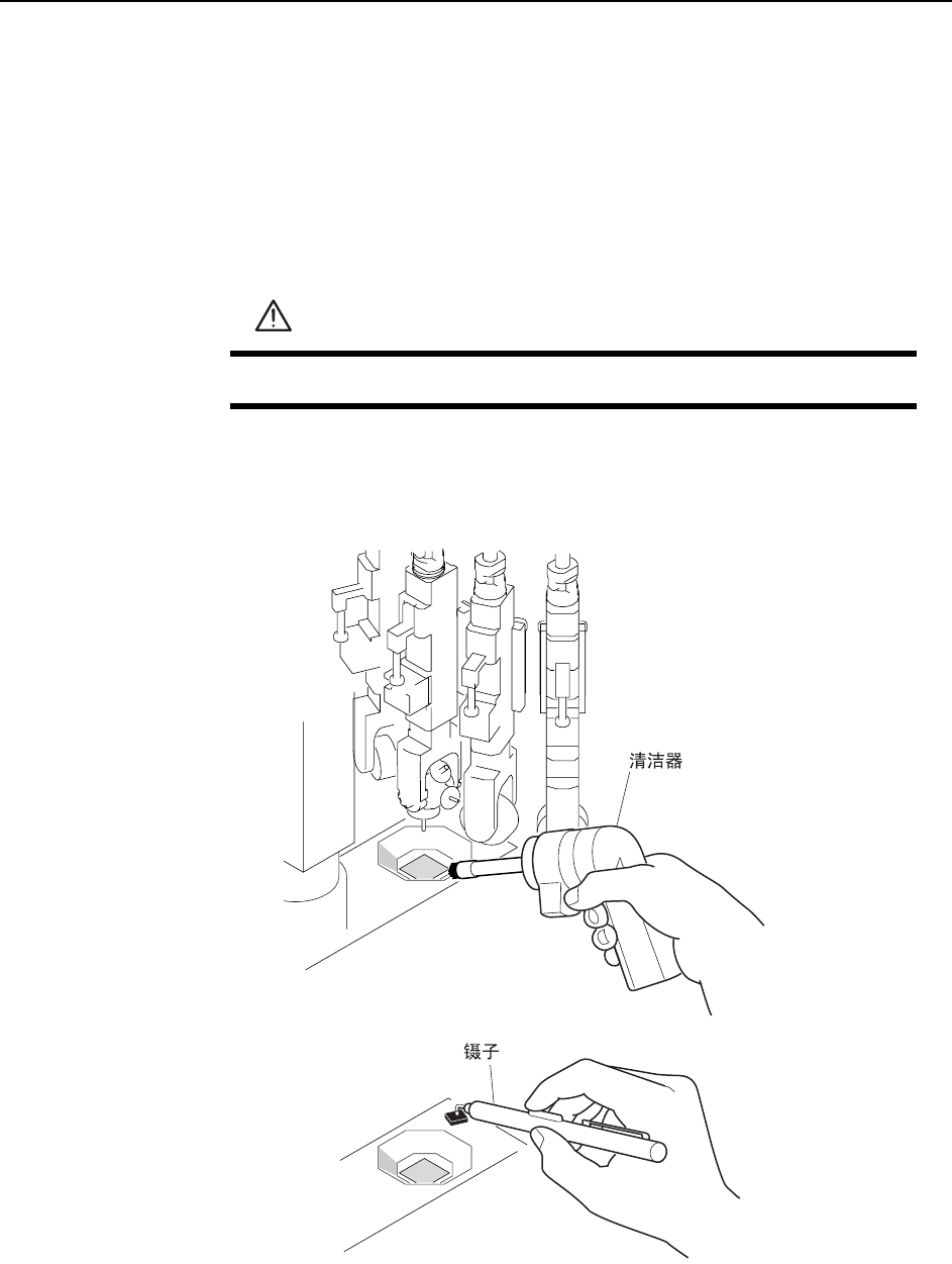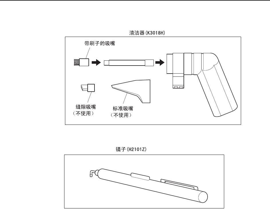 保养作业 >> 清 扫 5-4 MEC-CP-842-1.0S 5.1.4 除去相机玻璃面上的元件 ( 每 8 小时 1 次 ) 要 点 元件落到相机玻璃面上时, 会对影像处理产生不好影响。 请随时除去相机玻璃面上影响影像 处理的异物。 方 法 使用元件相机清扫用治具的清洁 器 (K3018H) 除去玻璃面上的异物。 对于不能吸取的大的异 物,请使用镊子 (H2101Z) 来除去。 注意 ) 清洁器上请安装配套的 [ 带刷子…